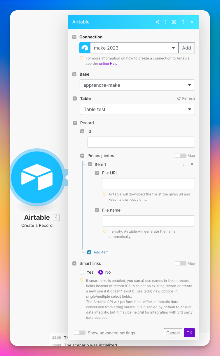 Sur Airtable, je souhaite créer un record en insérant les deux pièces jointes reçues dans mon mail directement dans le champs Pièces jointes.
