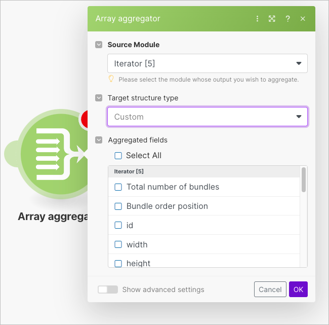 Nous allons récupérer l'url et le nom du fichier et se servir de l'array aggregator pour qu'il crée, pour nous, la structure de donnée adaptée attendue par Airtable.