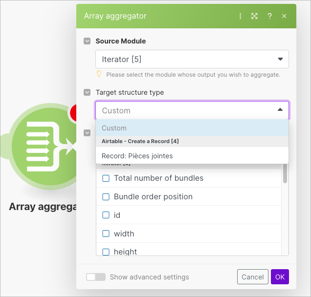 Vous allez cliquer sur Target structure type, mais avant soyez sûr que le module Airtable est bien branché juste après.